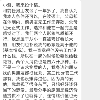 最后分手的原因是经济价值提供不了也就算了,连情绪价值也无法提供了。现在我很生气的一点是,我听说前任现在新谈了一个女朋友,刚谈恋爱就送爱马仕的礼物,虽然不是包包,但配饰什么的也要大几千,和我在一起一年多从没送过我这么贵的。共友问他为什么,他给出的答案是因为他现任的前任很有钱,不送点贵的拿不出手。我现在很生气,在一起的时候心疼他,想去吃日料都嫌贵不去吃